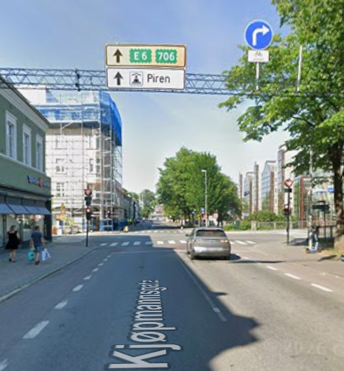Her er det flere kryss med høyreregel. Få hen til å snu i enden av veien og tilbake til lyskrysset og følg skilt sentrum.